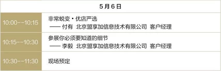 此外,在展会的最后一天——5月6日上午,盟享加将首次现场为展商朋友们答疑:初次参展需要注意哪些细节?哪些方式可以提高参展的招商转化?如何在展场里数百个品牌中脱颖而出?盟享加自身策展人为您解答参展疑问,并开启2019年展会预定!