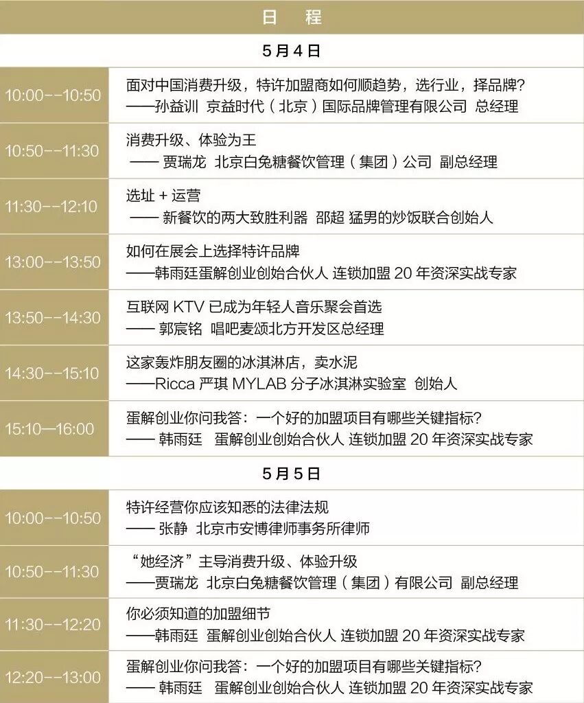 为满足广大投资人的急切需求,帮助大家从“盲目逛展找项目”升级为“找到最适合自己的好项目”,盟享加将借本次北京展会与“赋能——新势能 新连锁高峰论坛”之机,为大家带来平行论坛“投资加盟大讲堂:赢在起点,玩转特许经营”。届时,特许经营领域大咖们将联手解答投资人的加盟问题。