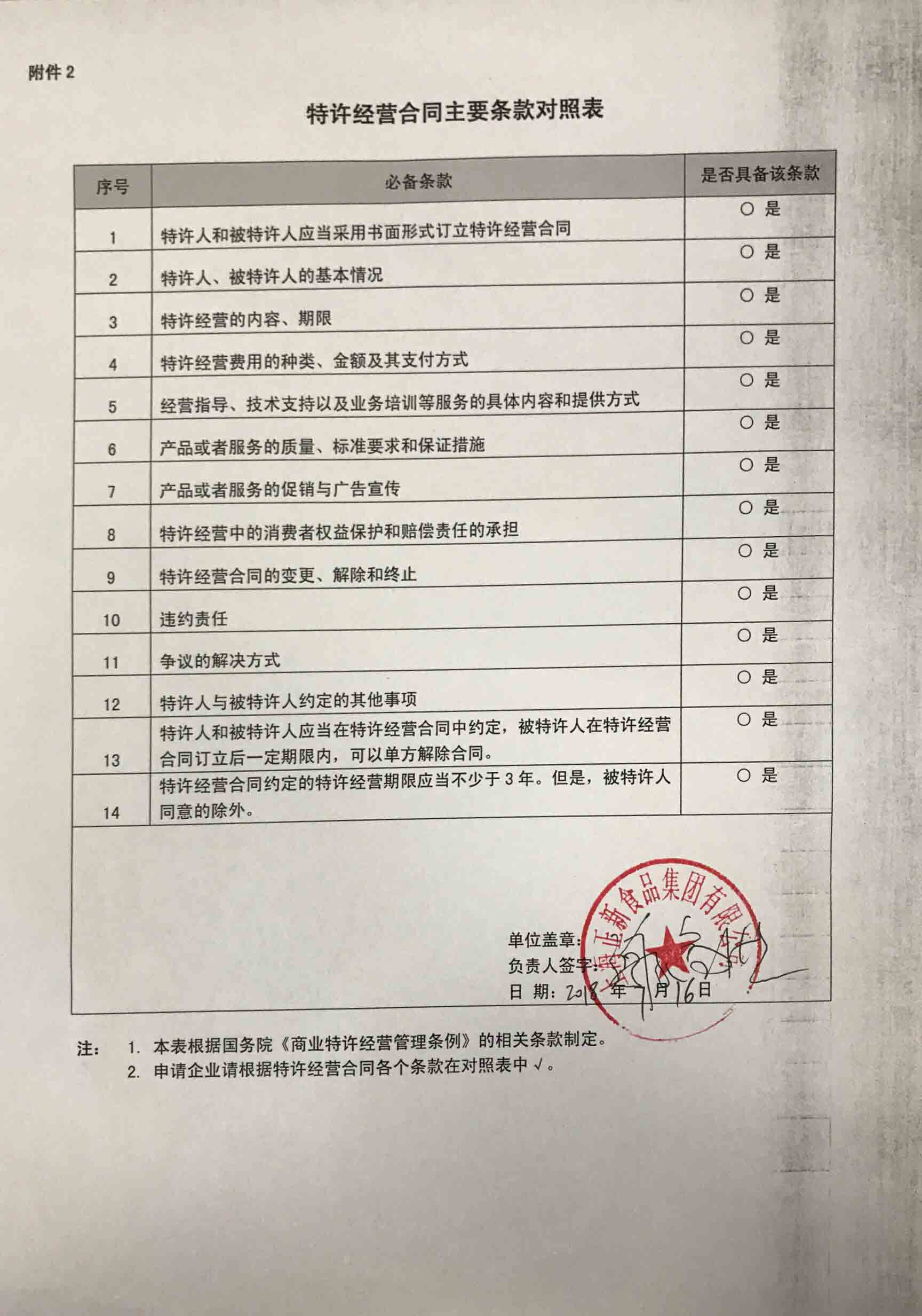 特许经营合同主要条款对照表