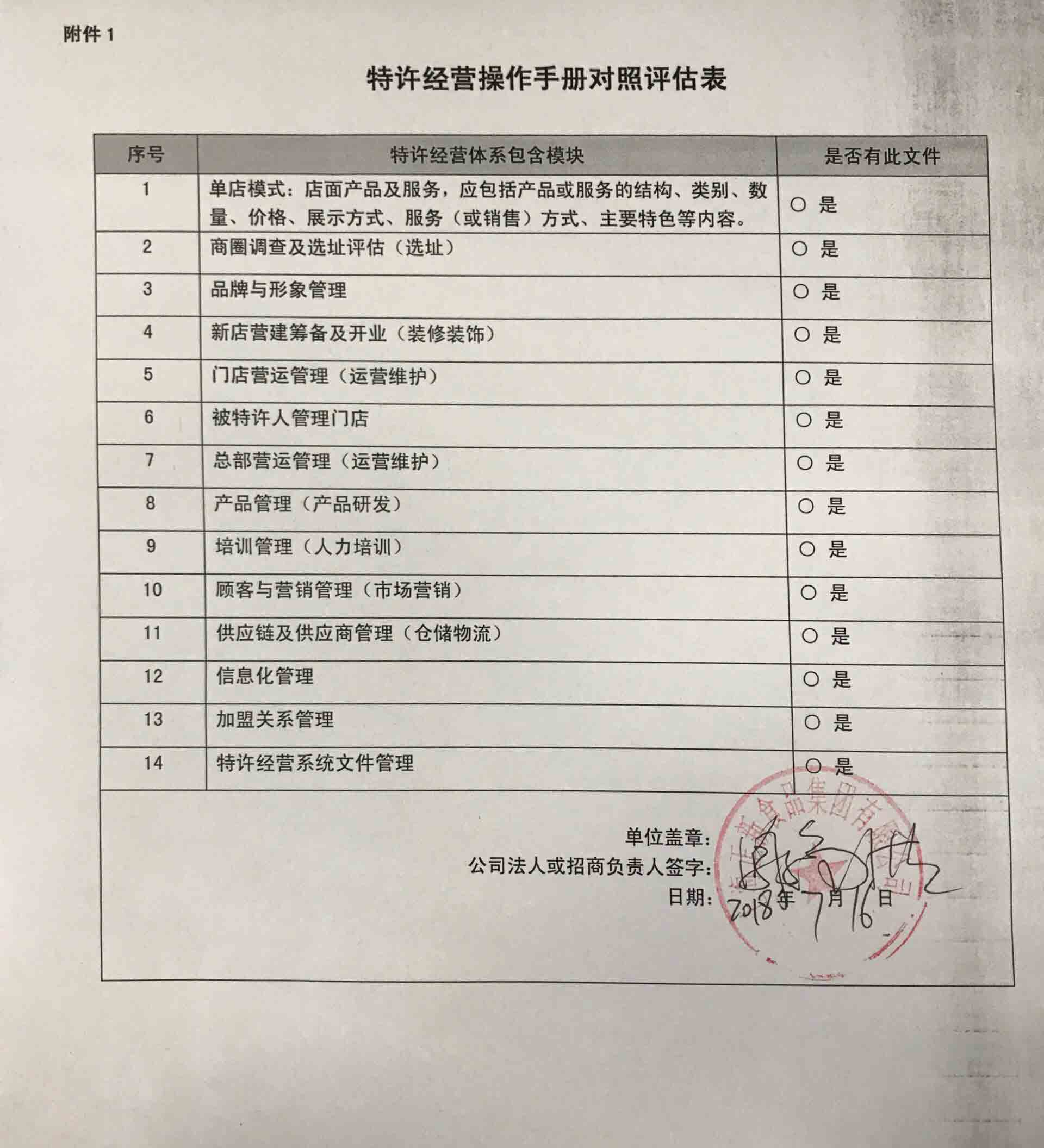 特许经营操作手册对照评估表